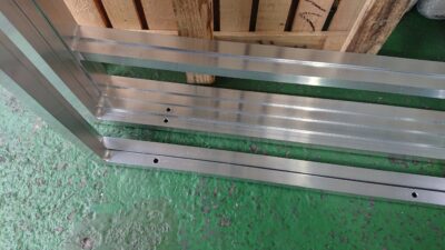 1-2、今回も完成(現地組み立て)寸法がH5000mmを越えるアルミ角パイプを溶接して作る枠がありますのでアルミ枠を注視すると穴があいているのが判ります。