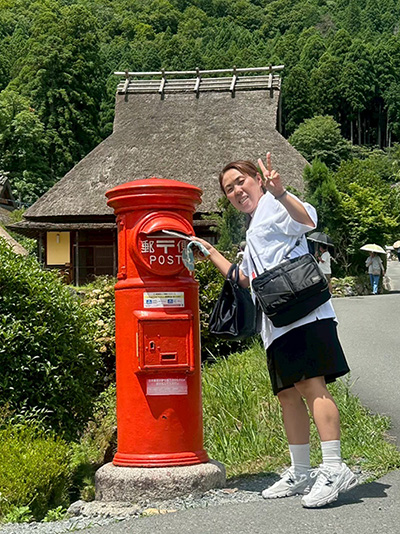 懐かしいポストを見つけ、かやぶきの民家をバックに写真をとりました。