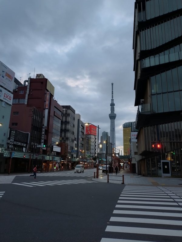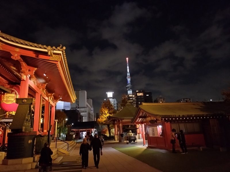 早朝でも出くわす人の半分以上はインバウンド客でした、ちなみに浅草寺の本殿からみた夜の風景はこんな感じ 東京スカイツリーがカラフルなLEDで綺麗でしたよ!