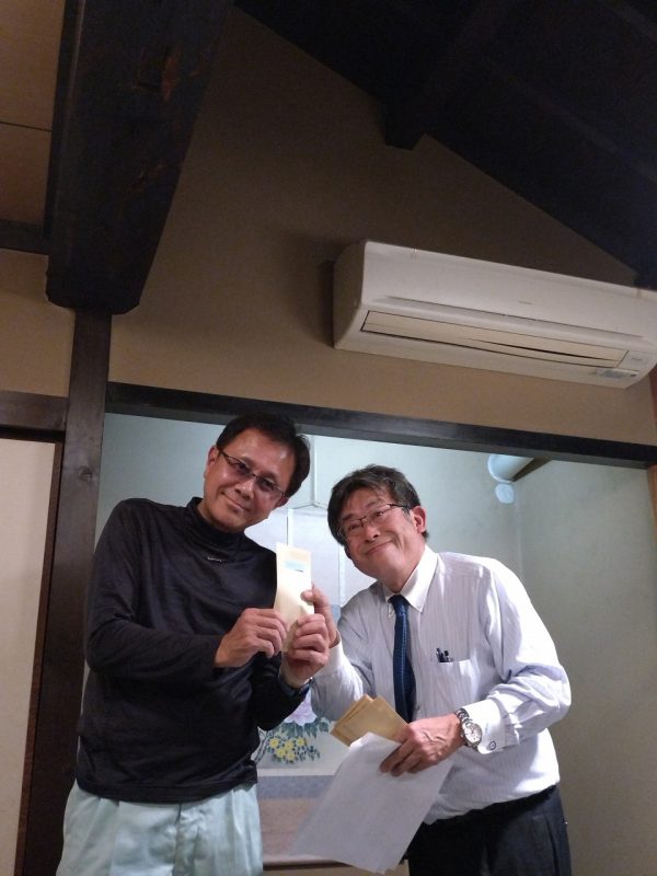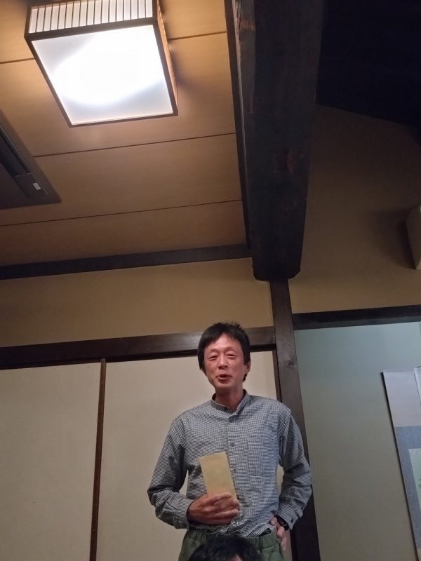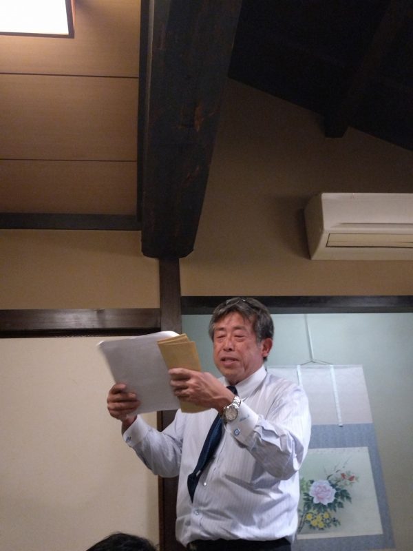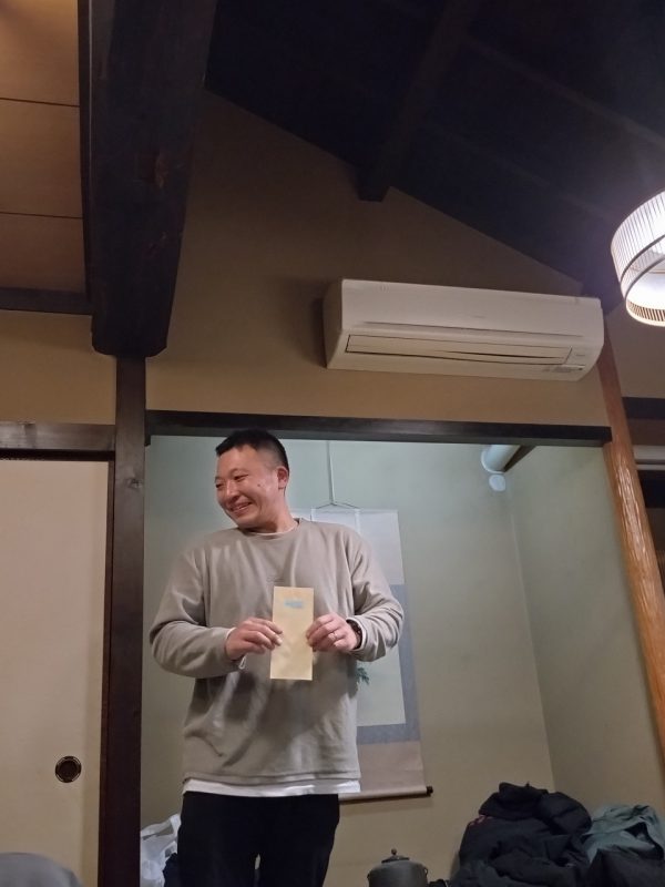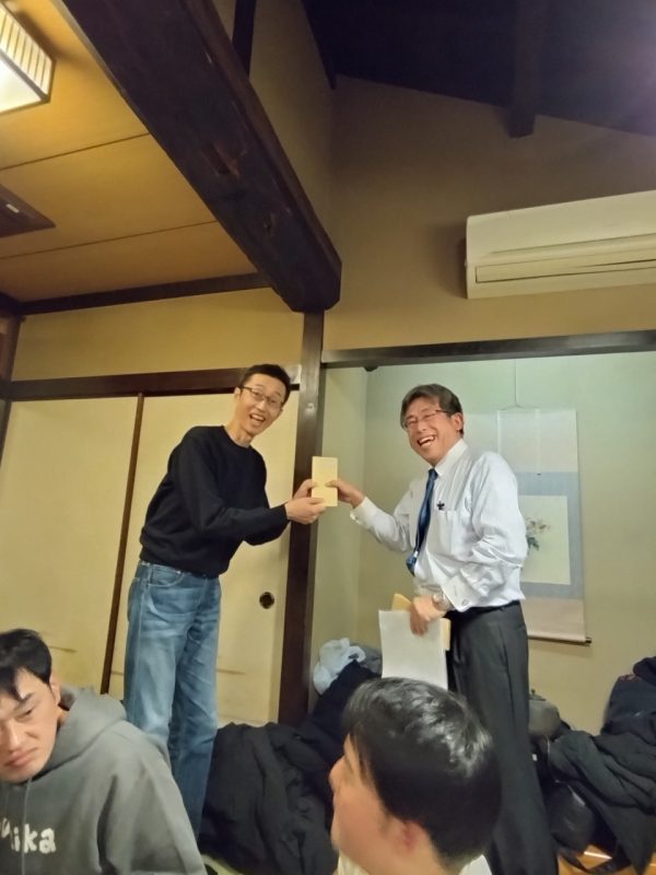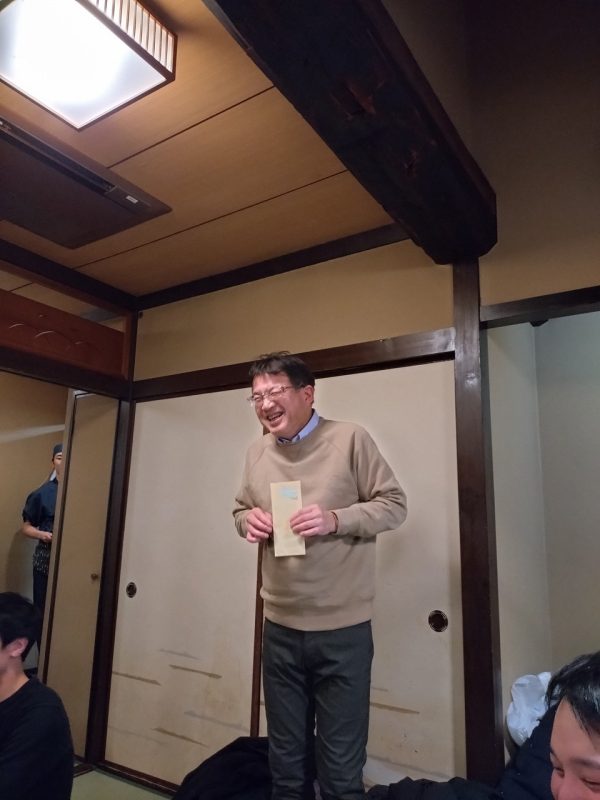 日頃は社長へのお金の締め付けが厳しい経理部の帖佐さんも今日は笑顔 出口部長からは今年も反省の弁がてんこ盛り そして7月1日入社の長尾さんには参加賞の代わりに名刺の贈呈でした