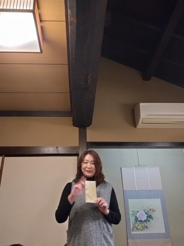お腹も少し満たされたころを見計らって望年会企画がスタート。今年も私から各スタッフにこの一年の頑張りを発表です、嬉し~~~~ 自分で打った文字ですが小さくて見えずらいのが玉に瑕 一所懸命に発表しておりま~す