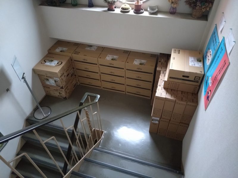 でも出勤は当然であります。わが社では不測の事態に備えるべく5年ごとにパソコンを入れ替えるようにしているのです。1台2台なら平日にできるのですが17台を一度に替えようとすると流石に業務が滞るだけでなくお客様にも迷惑が掛かりますので、業者さんにも無理をいって年末の慌ただしい時期に交換をお願いした限りは私も出勤せねばばちが当たります。 交換するパソコン一式は前日に届いており