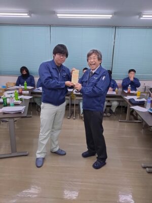さて今回はいかに・・・・・2024年の問題は難しかった!特に 首相は誰かの予想(正解は石破首相)と将棋の藤井聡太棋士が八冠を守れるか?!(正解は維持出来ない) 難問が多かったせいでしょう、今回の関金の正解率は4.75点(10点満点)と昨年の6.25点より-1.5点も低かったのであります。結果 2年連続の満点者は出ずでした。そんな中 見事7点のTOP賞をゲットしたお二人に社長賞が贈呈されました(南さんは2年連続で表彰 お見事!)