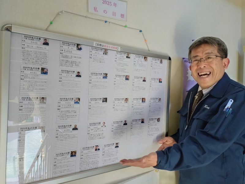 関西金属製作所では年末の大掃除(2024年12月27日)終了後に全員の「2025年の私の目標」が階段の踊り場に掲示されているのですが