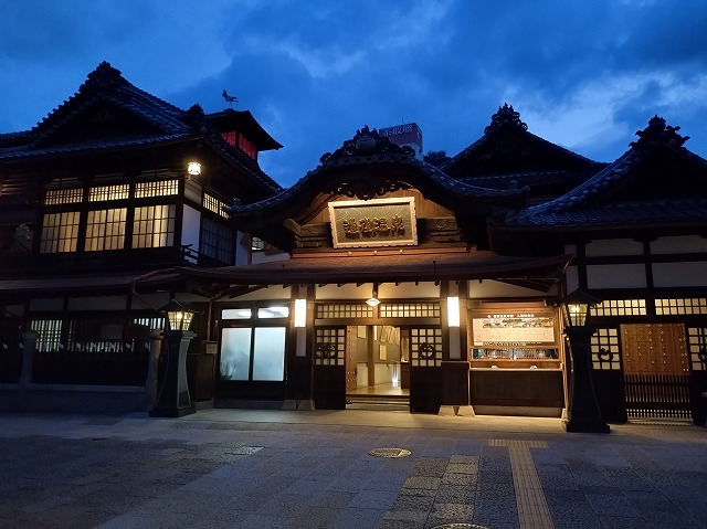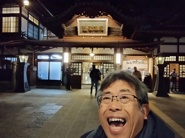 ホテルをなぜAM5時30分に出たか?その理由は 道後温泉本館の開門がAM6時 その開門を知らせる 太鼓が3回打ち鳴らされるのです。 それを一度確認したかった!6時前に到着すると同じお目的の方たちが並んでおられ太鼓の音とともに中に入れます。 まだ真っ暗です