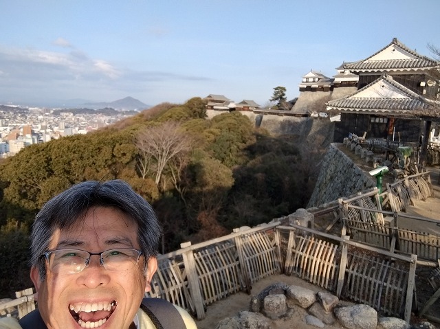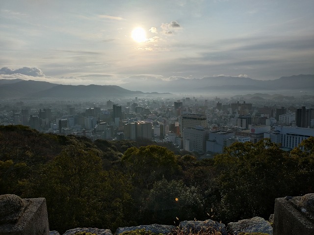 入浴後は 松山城までロングウォーキング お城からは朝霧に包まれた松山市内が一望