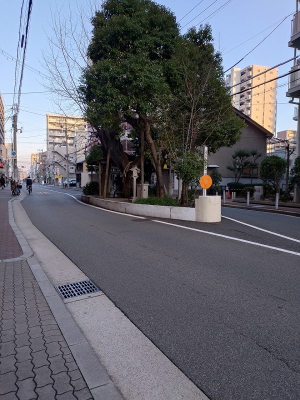 また歩いていると思わぬ発見もありました、片側一車線の中央に突然お社が出現