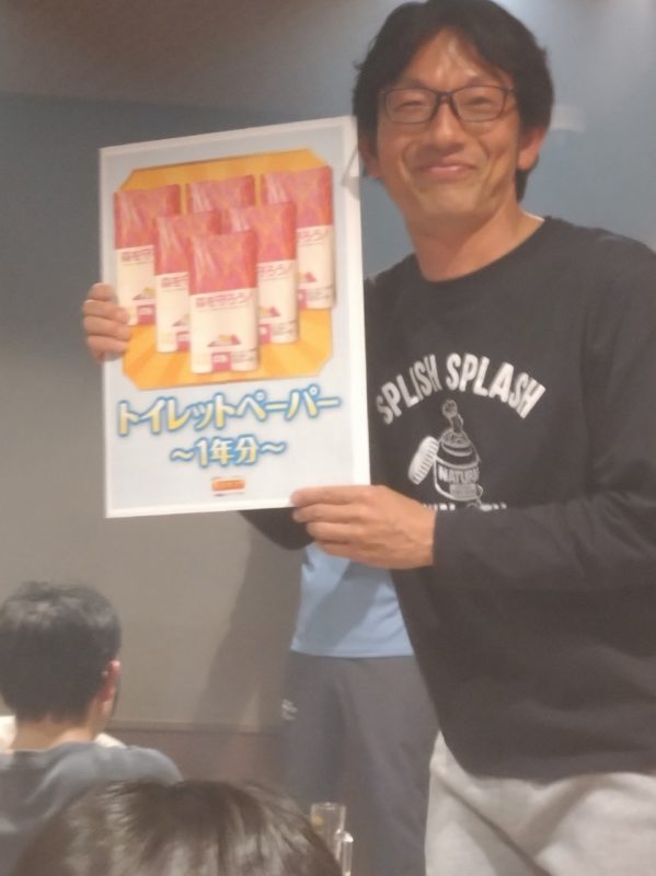 ボーリングの後は美味しい焼き肉をお腹いっぱいに食べてのお楽しみの表彰式へ突入。お米高騰の折ですので、ブランド米を4名がゲットしたり、なかなか手に入らないお酒もあり~の 爆笑賞品もありました。