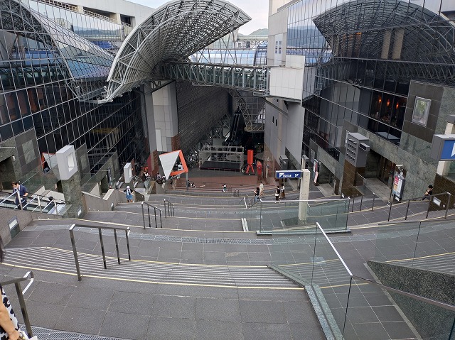 近くの京都駅の大階段はあまりの猛暑でガラガラでしたが、ビル内は人人人 観光客でごったかえす駅ビルで一服タイム (60分待ちでした)