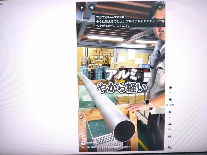 余談ですが こんな大きな丸パイプ(直径150φ×肉厚3.0㎜)鉄製ならとても出来ませんがアルミでは小指で持てる軽さなのです(大西課長のどや顔がモノがったでいます笑)