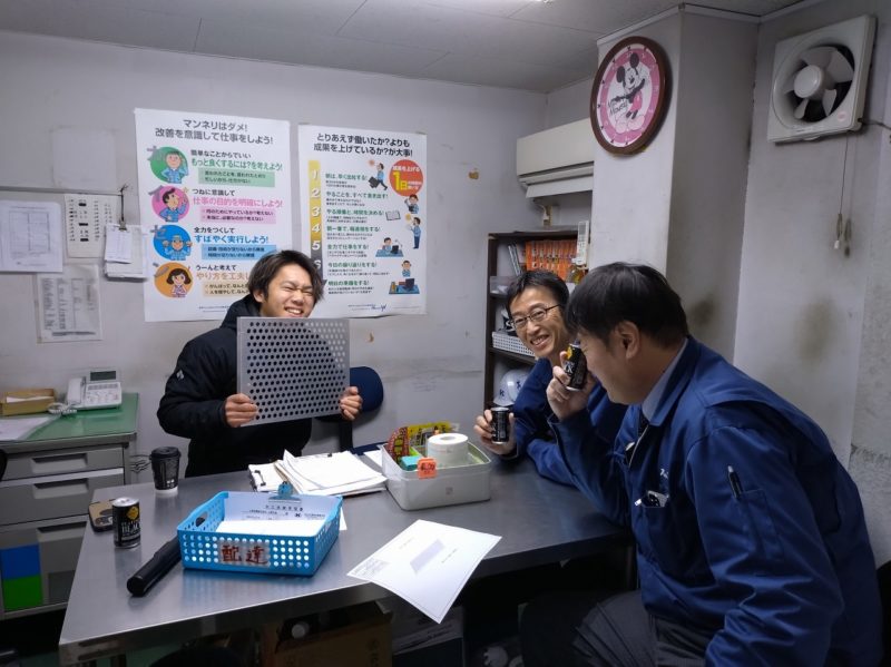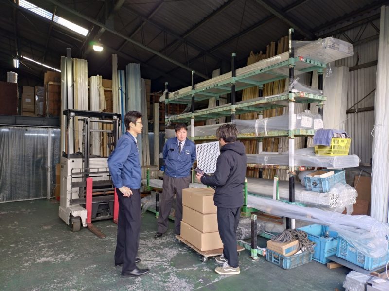 1月30日公開のテーマは、関西金属製作所の業務部メンバーがアットホームな職場を感じていたただく挨拶風景でした。今回は打合せルームや入出荷場を覗くとアルミ材を持っての打合せのようです・・・