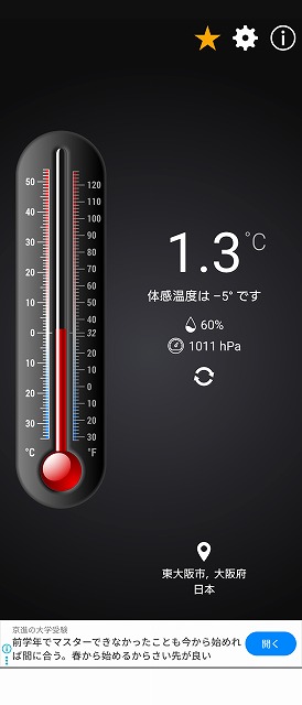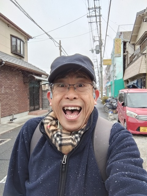 でも寒いものは寒い 8日(日)は北国と比較すれば気温は高い方ですが、それでも大阪の朝の温度は1.3°、風も吹いていましたので体感温度は-5°と表示され雪も降ってきました。